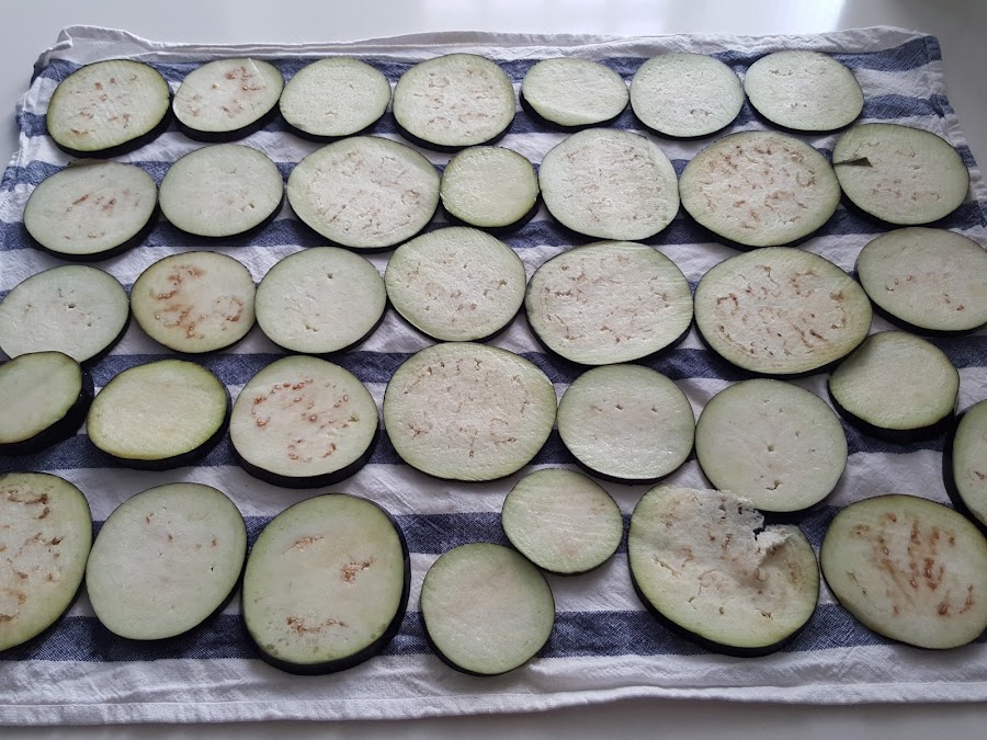3. - Pasado ese tiempo, sacamos las berenjenas del agua y las pondremos sobre un paño limpio, y secamos con otro paño por encima.