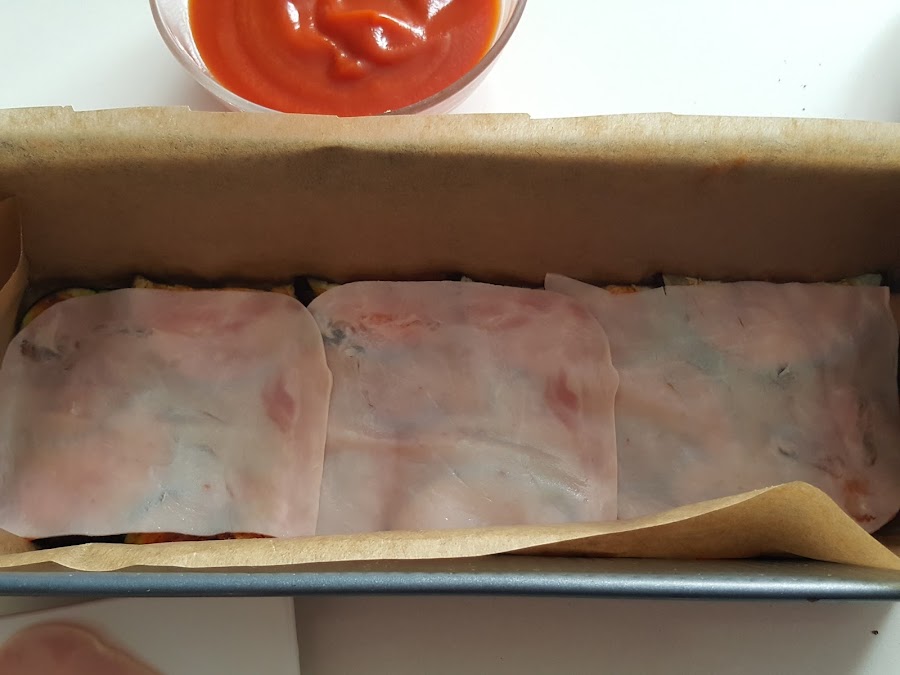 8. - Ponemos lonchas de jamón en la siguiente capa.