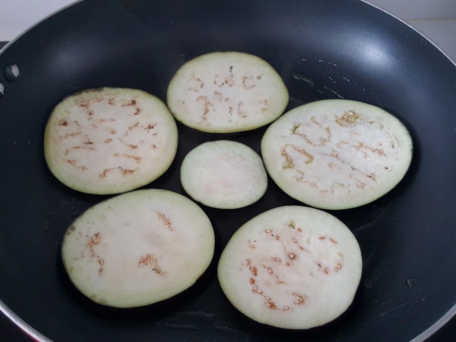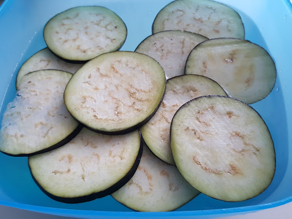 2. - Cortamos las berenjenas en rodajas y las vamos introduciendo en el agua, para que pierdan el amargor. Las dejaremos ,al menos, media hora.