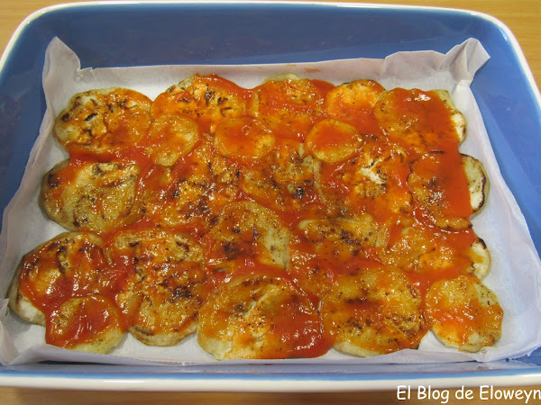 Ponemos una primera capa de salsa de tomate sobre las berenjenas. Podéis usar una cuchara para extender la salsa de forma uniforme. No se ha de poner demasiada.