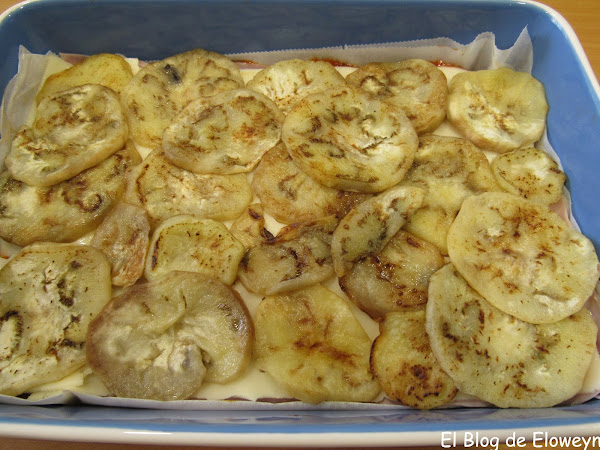 A continuación vamos a poner una primera capa de berenjenas en un molde apto para horno untado con aceite para que no se pegue. En mi caso, puse un papel para horno para que no se pegase, pero luego a la hora de desmoldar fue un poco lioso. Os recomiendo que mejor pongáis antes una capa de aceite.