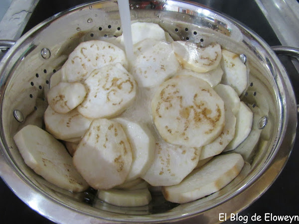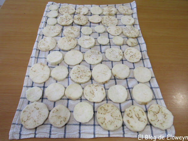 Una vez ha pasado la media hora, lavamos bien las rodajas de berenjena para eliminar el exceso de sal.