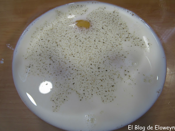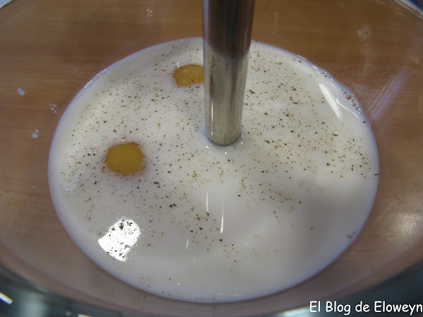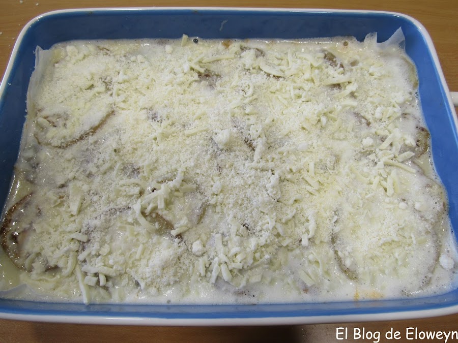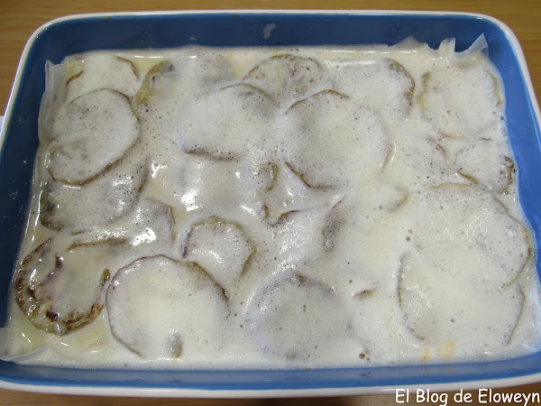 Lo añadimos poco a poco a la bandeja con las berenjenas. Moved un poco la bandeja para que la mezcla de huevos y leche se cuele por todos lados. Hemos de añadir la mezcla hasta cubrir las berenjenas. Quizá os sobre un poquito.