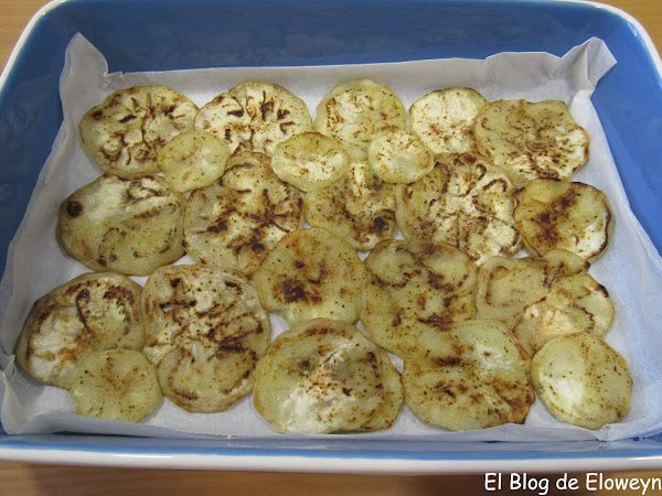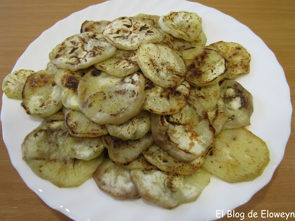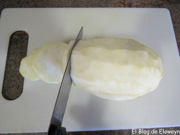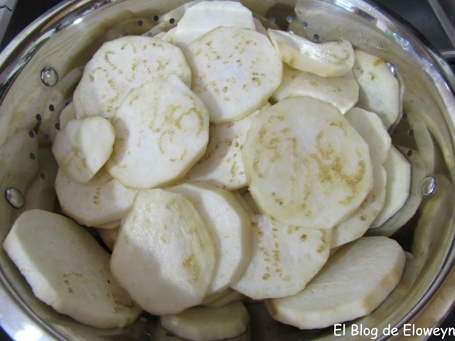 Pelamos las berenjenas y las partimos en rodajas de medio centímetro aproximadamente.