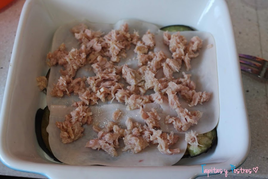 Vamos haciendo capas en este orden hasta que se nos acaben los ingredientes. Acabamos con una capa de berenjena y encima queso rallado. Horneamos a 180º unos 25 minutos aproximadamente.