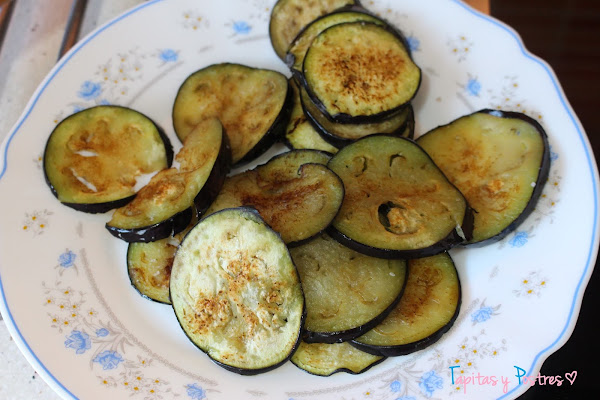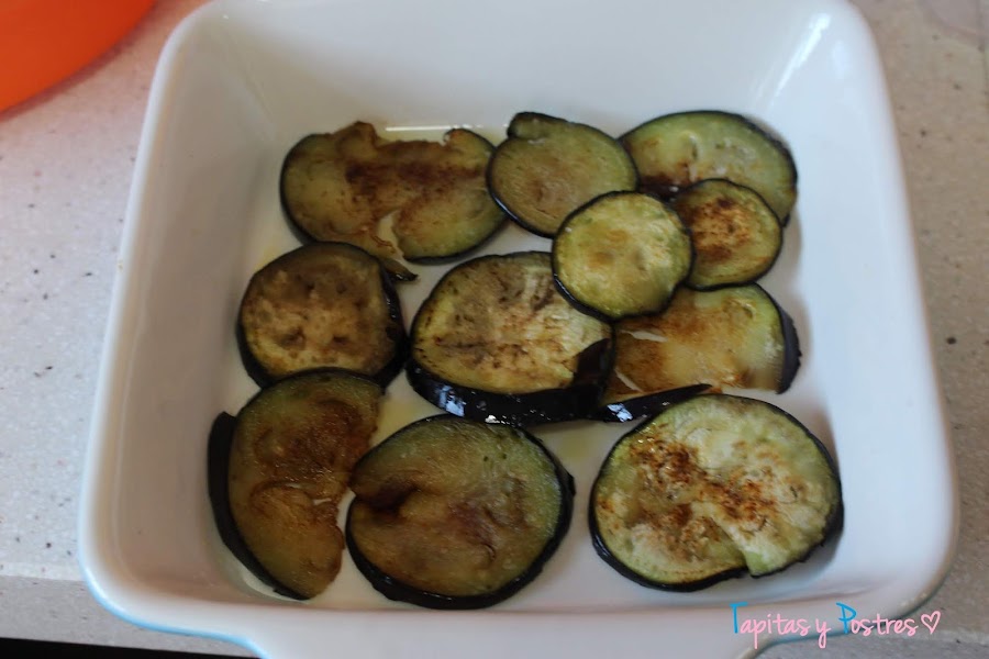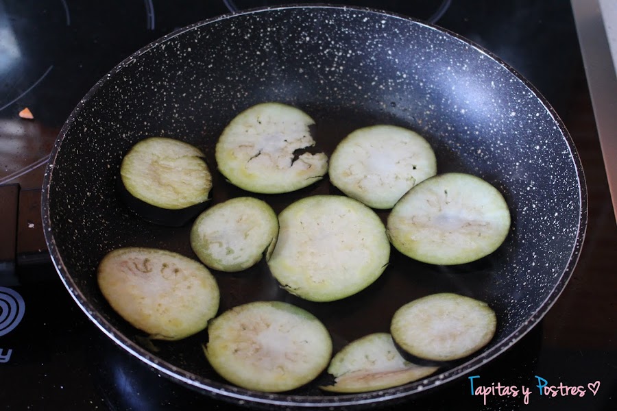 Cortamos las berenjenas en rodajas y las hacemos en una sartén a la plancha con un poquito de aceite. Las reservamos.