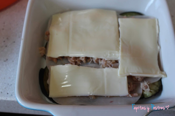 Y las lonchas de queso. Vamos haciendo capas hasta que se nos acaben los ingredientes.