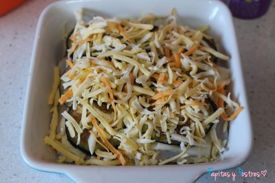 Acabaremos con una capa de berenjenas y encima ponemos el queso rallado. Al horno.