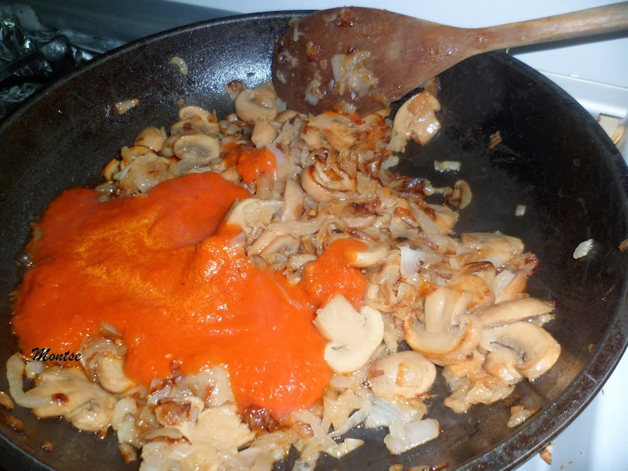 Pondremos una sartén con 3 cucharadas de aceite y echaremos la cebolla la tendremos a fuego medio durante unos minutos cuando empiece a tomar color echaremos los champiñones laminados.