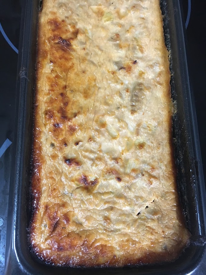Se unta un molde rectangular con aceite y se vierte la mezcla en él. Se introduce en el horno caliente a 180ºC con calor arriba y abajo en un baño María.