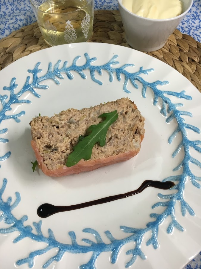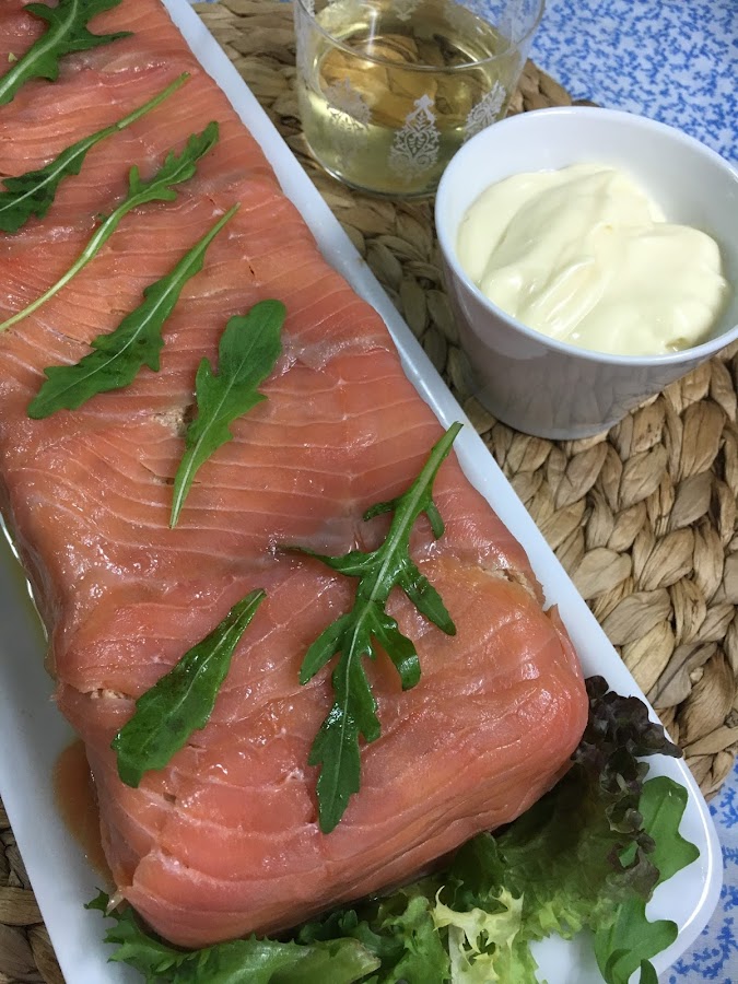 Se decora con el salmón ahumado extendido por su superficie y con rúcola y se acompaña con salsa mayonesa.