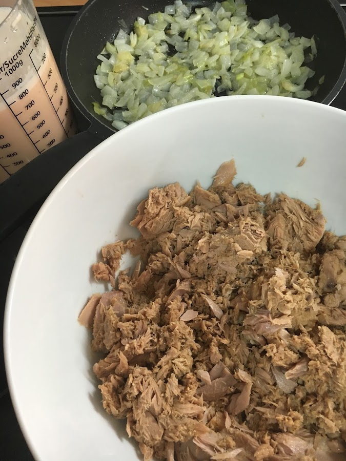Se pone en un bol o ensaladera el atún o bonito escurrido y se desmenuza con un tenedor. Se pone en el vaso de la batidora la leche evaporada, los huevos, el tomate frito y se salpimenta. Se bate hasta que esté todo integrado.