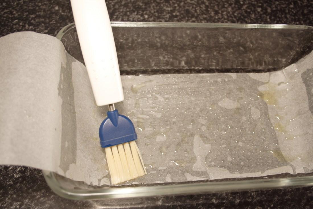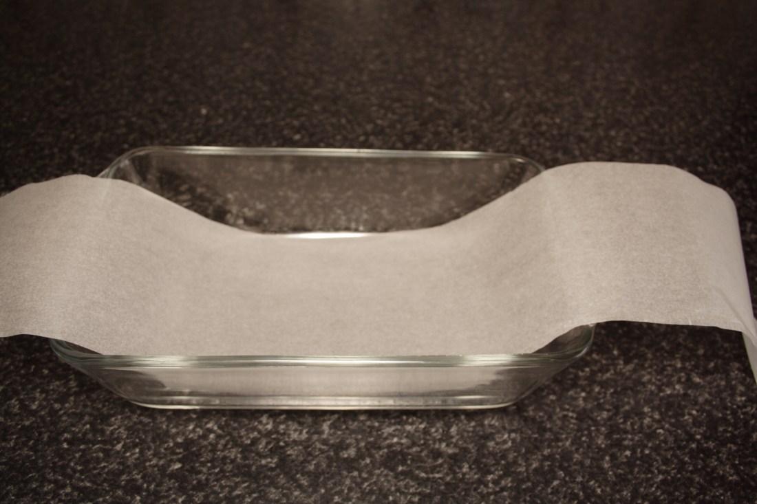 Escogemos un molde rectangular (tipo plum cake de 12,5 cm ancho x 22 cm largo x 5,5 cm profundo). Colocamos una tira de papel de hornear en el fondo y a lo largo del molde, dejando un par de pestañas colgando (para facilitar el desmoldado).
