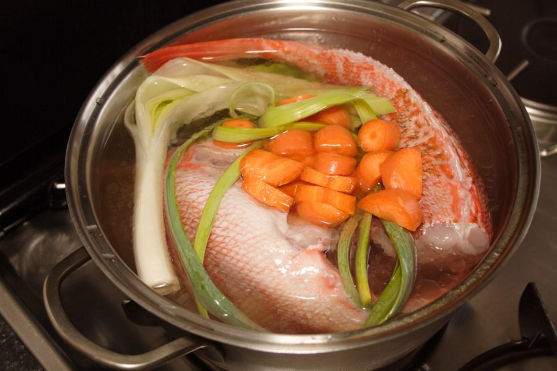 Ponemos agua a calentar en una cazuela mediana, echamos el puerro, la zanahoria y el pescado sin cabeza, sazonamos y cocemos hasta que el pescado esté hecho. Sacamos de la cazuela. Una vez templado desmenuzamos, retirando las espinas, la piel y demás impurezas y reservamos.