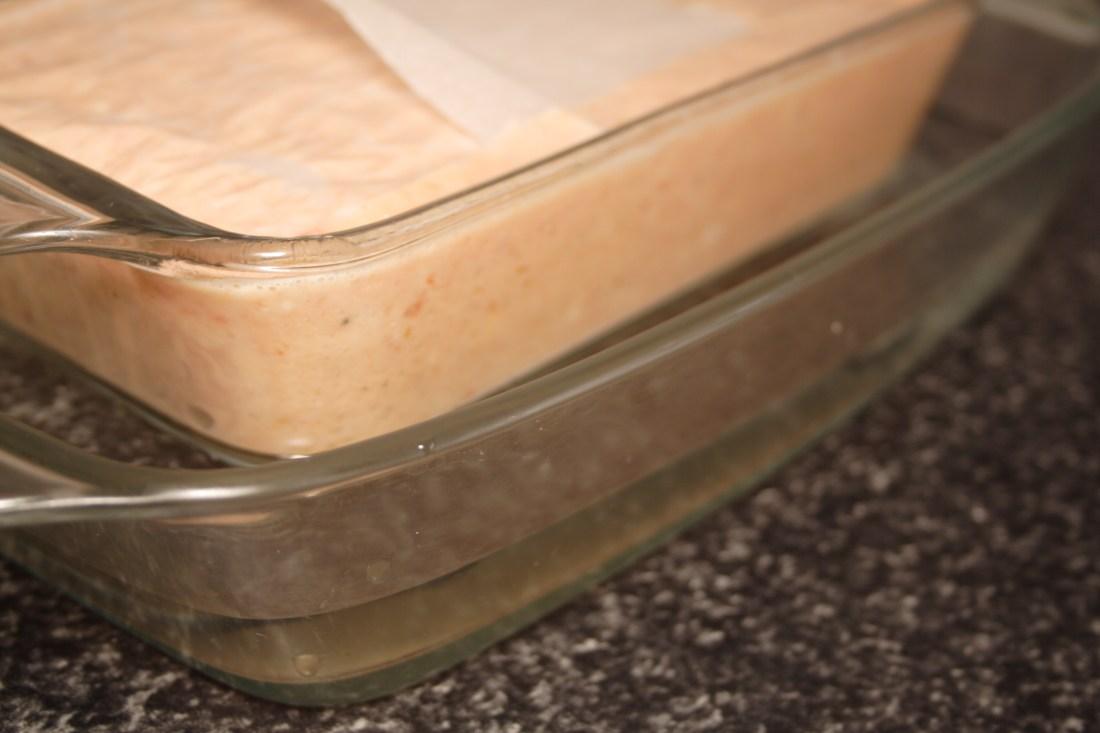 Vertemos la mezcla en el molde y horneamos al baño María 45 minutos (ya sabemos que cada horno es un mundo, el tiempo es orientativo) a 180ºC, calor arriba y abajo. Colocaremos nuestro pastel de la mitad del horno hacia abajo.
