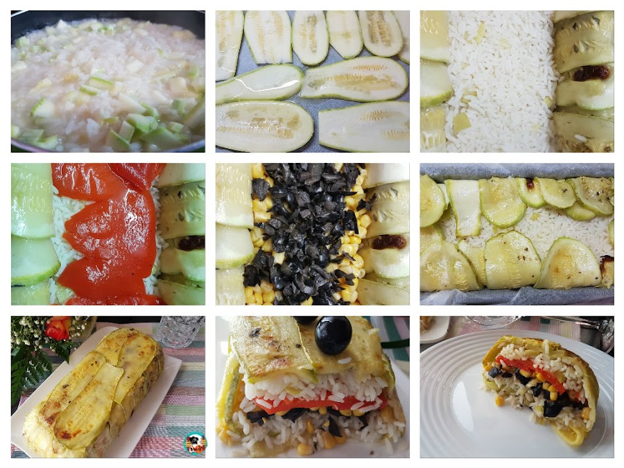 3.-Forramos un molde rectangular con papel de horno. Disponemos las lonchas de calabacinos sobre el molde, como se muestran en las imágenes de los pasos (cubriendo las paredes del mol del y el fondo del molde. Rellenamos el fondo del molde con arroz cocido, con un 1 cm de grosor. Escurrimos bien los pimientos rojos, los abrimos por la mitad y los disponemos sobre el arroz. Añadimos el maíz dulce escurrido y las aceitunas cortadas en trozos pequeños. Añadimos otra capa de arroz, apretamos bien con una cuchara sobre el arroz.