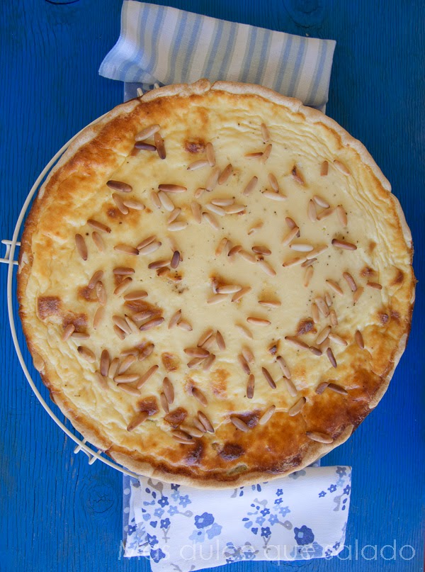 Introducir en la zona central del horno durante unos 35 minutos, que veamos que los bordes han comenzado a dorarse. Abrir el horno y con cuidado esparcir los piñones por toda la superficie y hornear unos 10 minutos más, vigilando que no se nos quemen los piñones y que el pastel está cuajado, para ello introducir un palito en el centro.