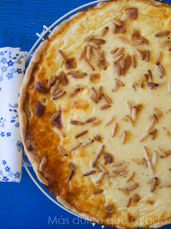 He cambiado algunos de los ingredientes adaptandolos a nuestros gustos y a lo que tenía en casa. He sustituido la masa de hojaldre por masa quebrada y el rulo de cabra por queso brie, también he incorporado a la receta un huevo más y además le he puesto menos cantidad de leche, también le he añadido un poquito de cebolla. La he tuneado un poco, pero la esencia de la receta es la misma.