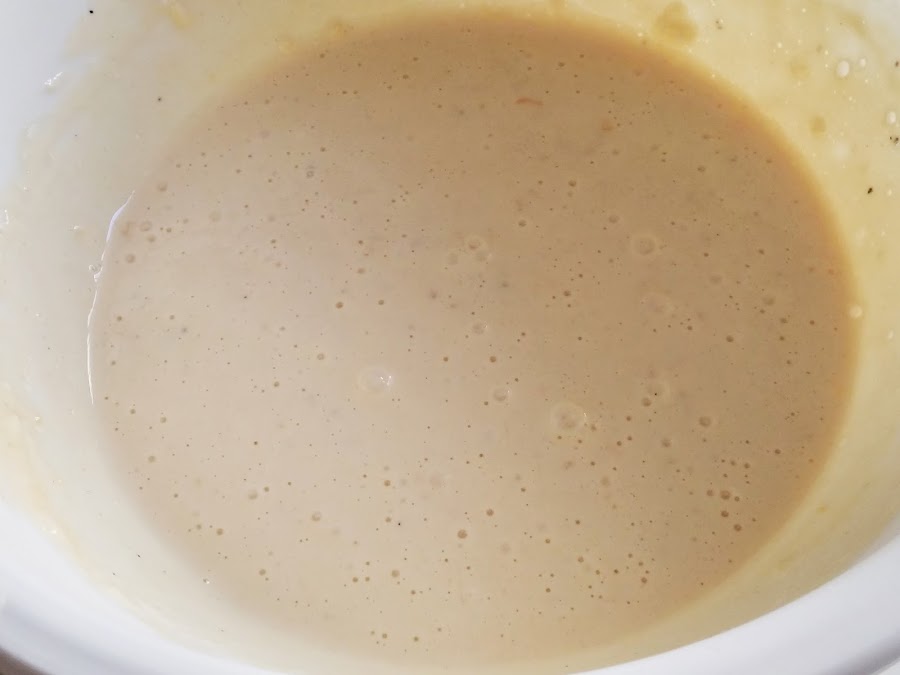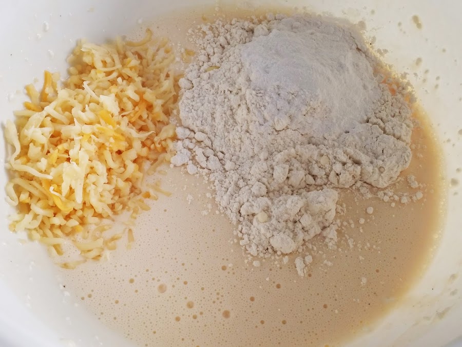 2. - Una vez esté bien mezclado, le añadimos la harina con la levadura y el queso rallado y mezclamos de nuevo.
