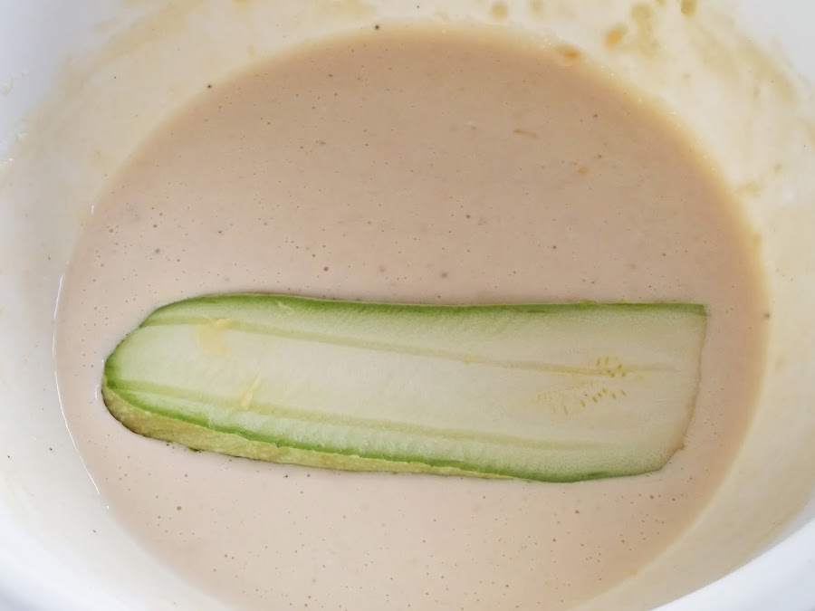 5. - Vamos sumergiendo las tiras de calabacín en la masa y las vamos colocando en un molde de horno untado con mantequilla.