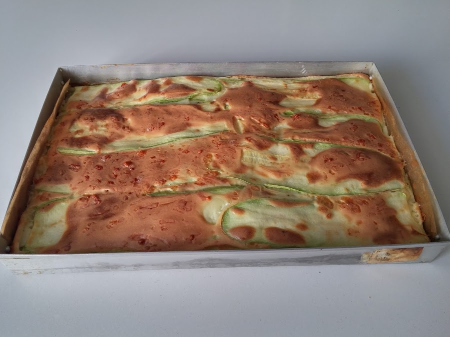 6. - Una vez tengamos todo el calabacín colocado, si nos sobra masa se la volcamos por encima y metemos al horno 40 minutos.