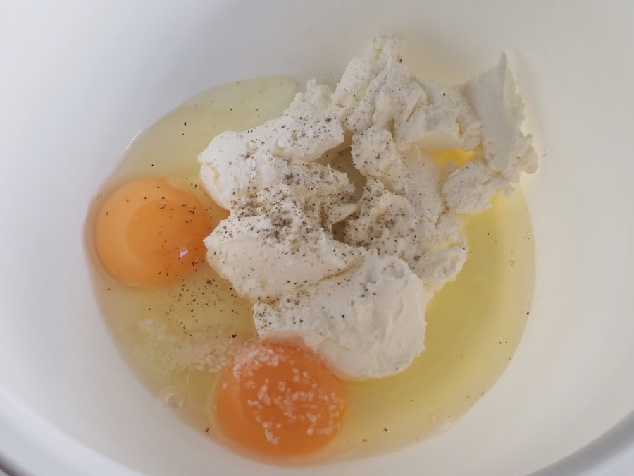 1. - Encendemos el horno a 200º y ponemos en un bol los huevos junto con el queso de untar, la sal y la pimienta.