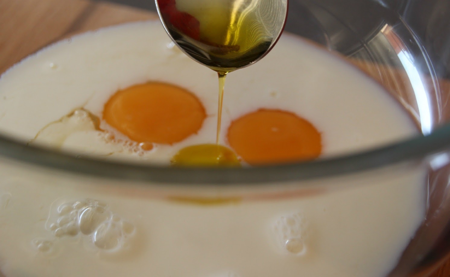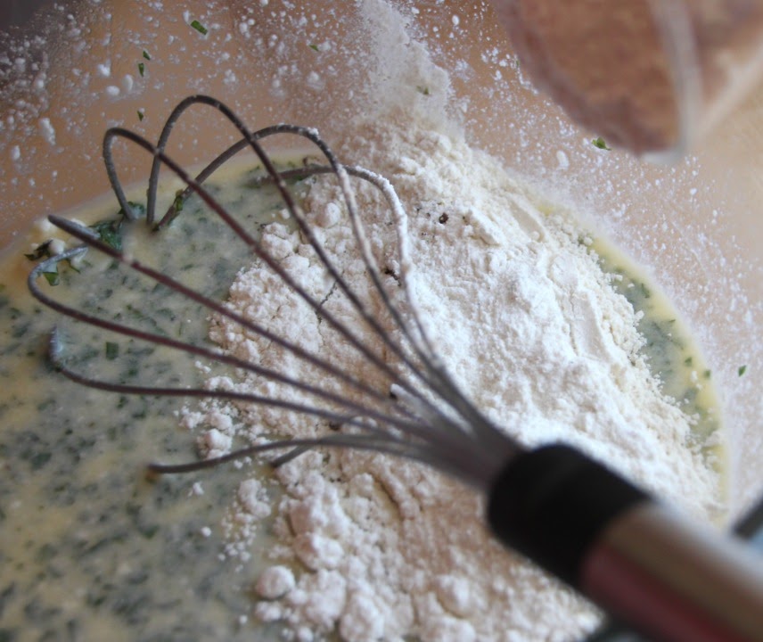 A continuación, la harina tamizada y la levadura. Salpimentamos y mezclamos bien.