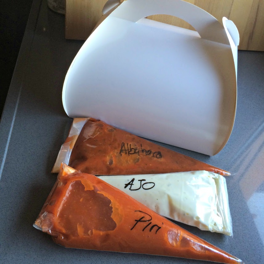 Preparas las salsas. las pones en unas mangas pasteleras bien cerradas y puede ser un obsequio muy bien recibido estas fiestas Navideñas, en cualquier lugar al que vayas.