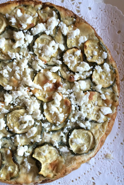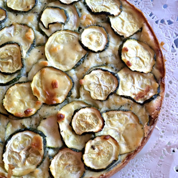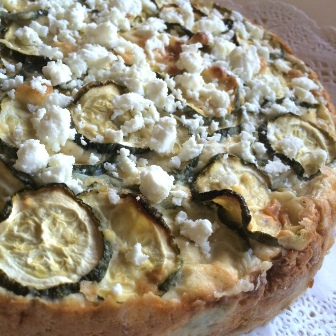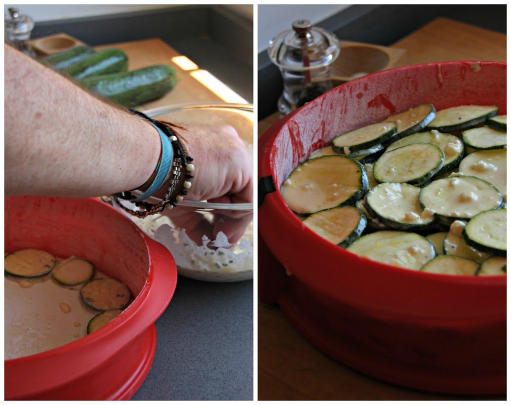 Engrasamos un molde de 20 cm de diámetro con la mantequilla y espolvoreamos con un poco de harina. Vertemos la mezcla, suavemente con una cuchara, colocando un poco las rodajas de calabacín para que quede más bonito a la vista.