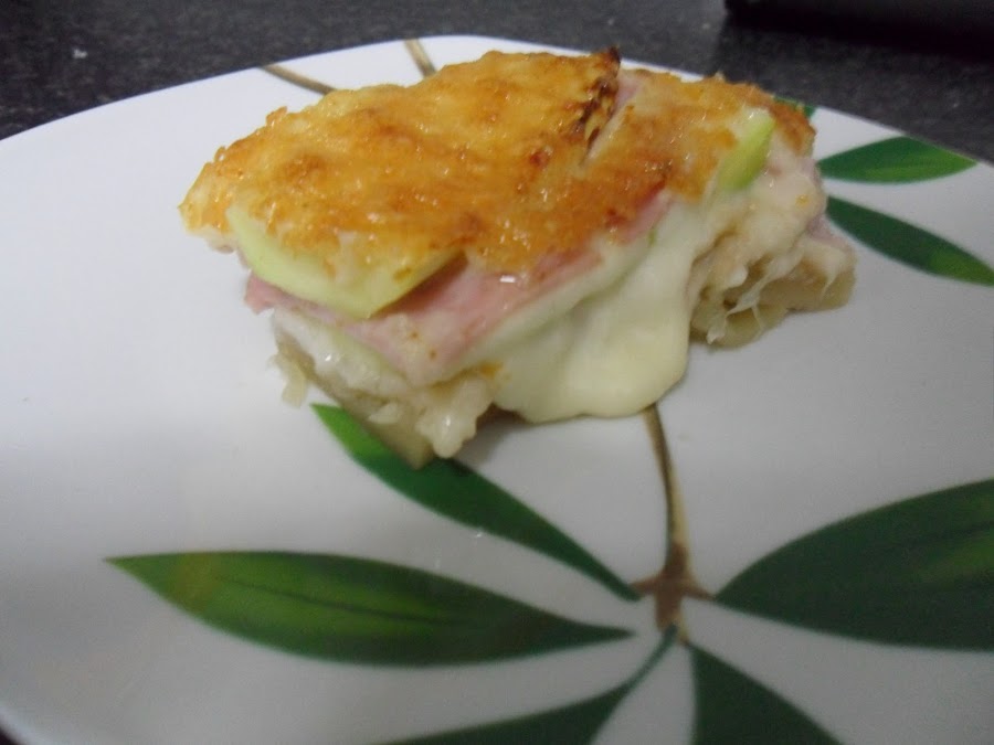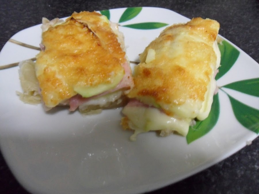 1º - Cortamos el calabacín en filetes bien finos y los montamos en forma de libro con jamón york y queso de loncha . ( Calabacín - jamón york - queso - calabacín ) .