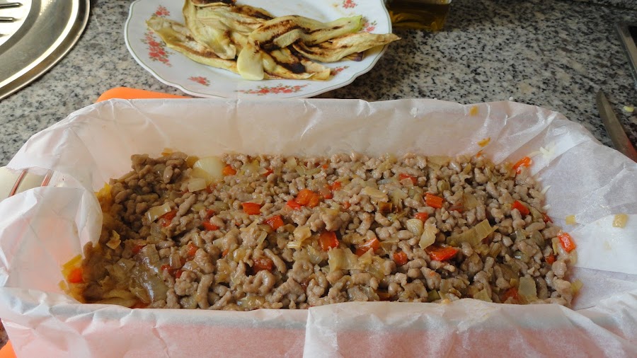 Para montar el pastel colocamos un papel vegetal en un recipiente rectangular y vamos colocando lonchas de berenjena/calabacín, encima un poco de queso rallado, la preparación de la carne, queso.... vamos repitiendo capas hasta terminar con queso. Ponemos al horno previamente calentado a 180º durante 25-30 minutos. En la foto sale la piel de la berenjena y parece quemado, la foto está regular, pero el pastel riquísimo.