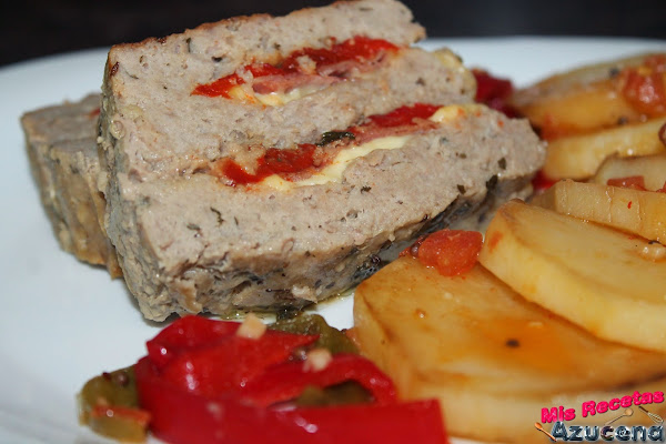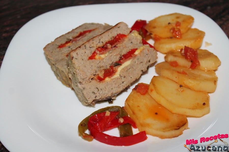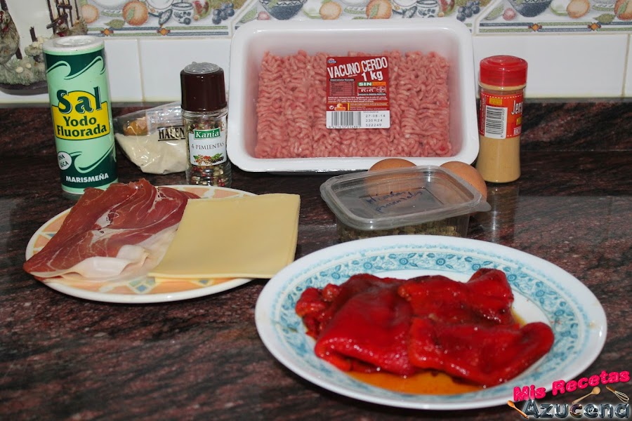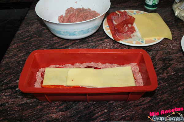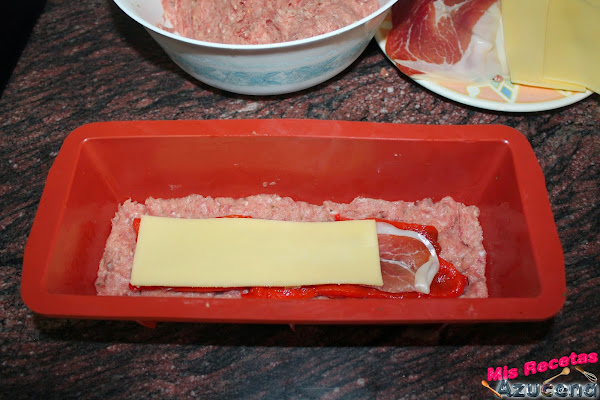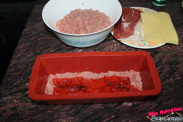 Una vez tengamos el molde listo empezaremos poniendo una capa de carne de poco más de un dedo de grosor, la emparejamos bien en el molde, en la parte del centro colocaremos una capa pimiento asado.
