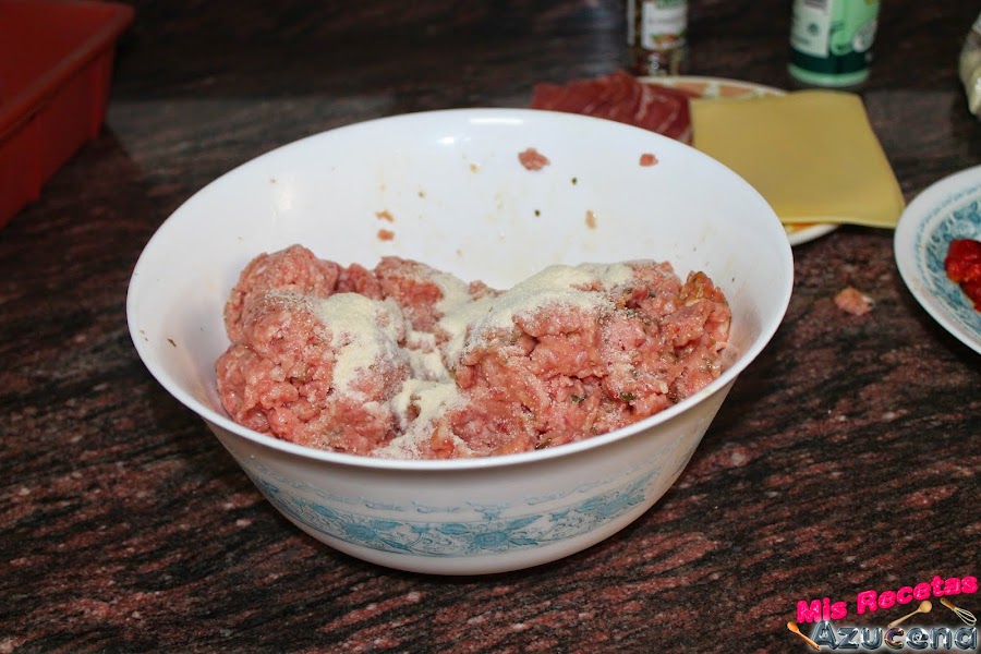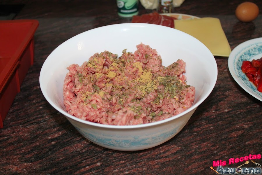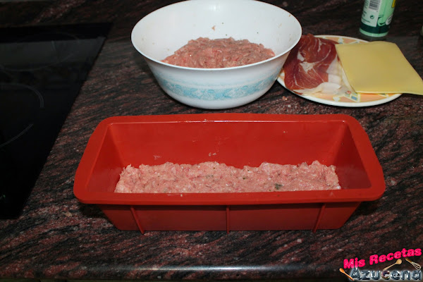 Ahora pondremos otra capa de carne del mismo grosor cubriendo todo y apretando un poco por los lados para que se nos peguen bien los bordes que hemos dejado sin cubrir con el relleno.
