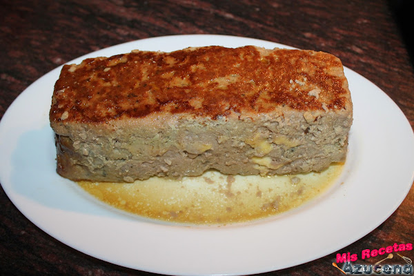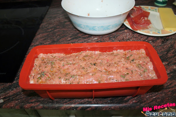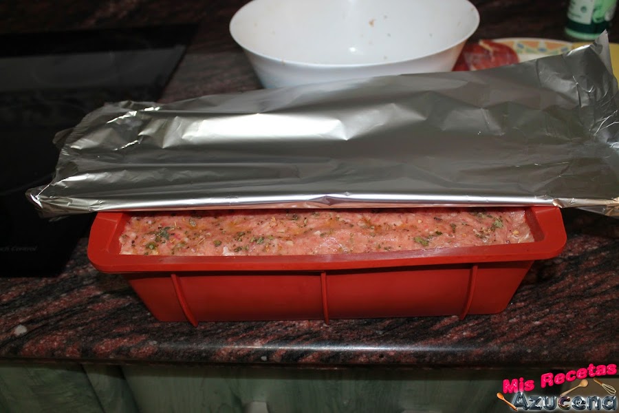 Por ultimo taparemos con el resto de carne que nos queda presionaremos bien para que se pegue toda la carne y le untaremos un poco de aceite por encima de la carne y pondremos unas pocas de hiervas provenzales por encima, tapamos el molde con papel de aluminio y lo metemos en el horno durante 45 minutos.