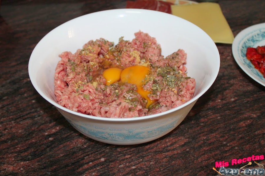Cogemos un bol y pondremos la carne, añadiremos el jengibre, las hiervas provenzales, seguiremos con los huevos, los cascamos y añadimos a la masa de carne, por ultimo añadimos el pan rallado y salpimentamos, mezclamos bien toda la carne con los ingredientes.