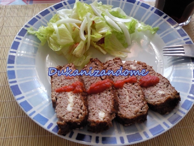 Otro pastel de carne picada, pero con distintos ingredientes. Además este está relleno de queso y con una salsita de tomate dukan, está riquísimo.