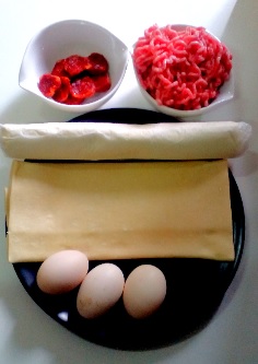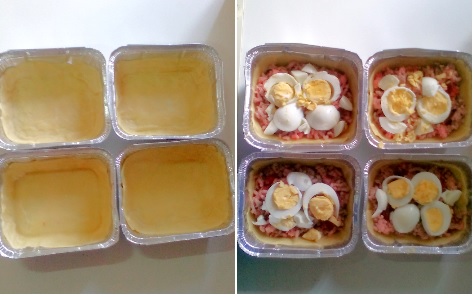 Ahora colocamos sobre la masa quebrada el relleno, la carne el chorizo y los huevos (1 huevo para cada pastel).