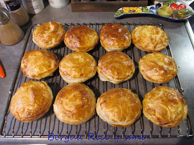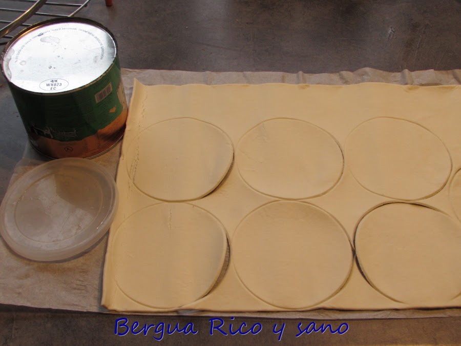 * Los retales y esquinas de masa que nos han ido quedando, los juntamos, presionamos con las manos o con un rodillo, pero sin hacer más fina la masa, y sacamos más círculos de masa hasta que ya no nos quede hojaldre.