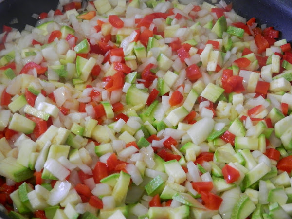 Picamos la cebolla, el calabacín y el pimiento en trocitos muy pequeños.