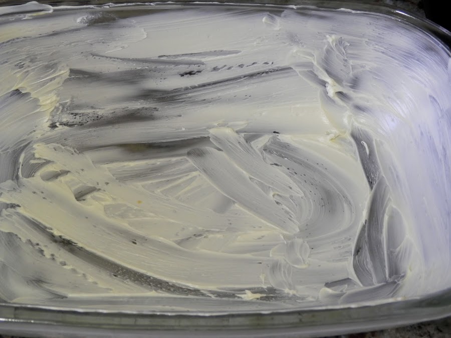 Cuando ya tengamos todas las preparaciones por separado, engrasamos un molde de horno con mantequilla o margarina, también lo podéis hacer con aceite si os gusta más.