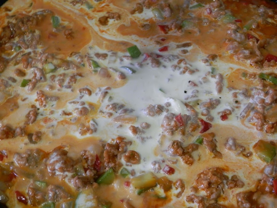 Cuando ya esté casi cocinada la carne, añadiremos el tomate frito y la nata (crema de leche) y damos vueltas y dejamos cocer, es el momento de añadir las especias que os gusten, en nuestro caso he puesto ajo en polvo y orégano, a mis chicos no les gustan demasiado las especias.