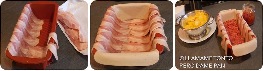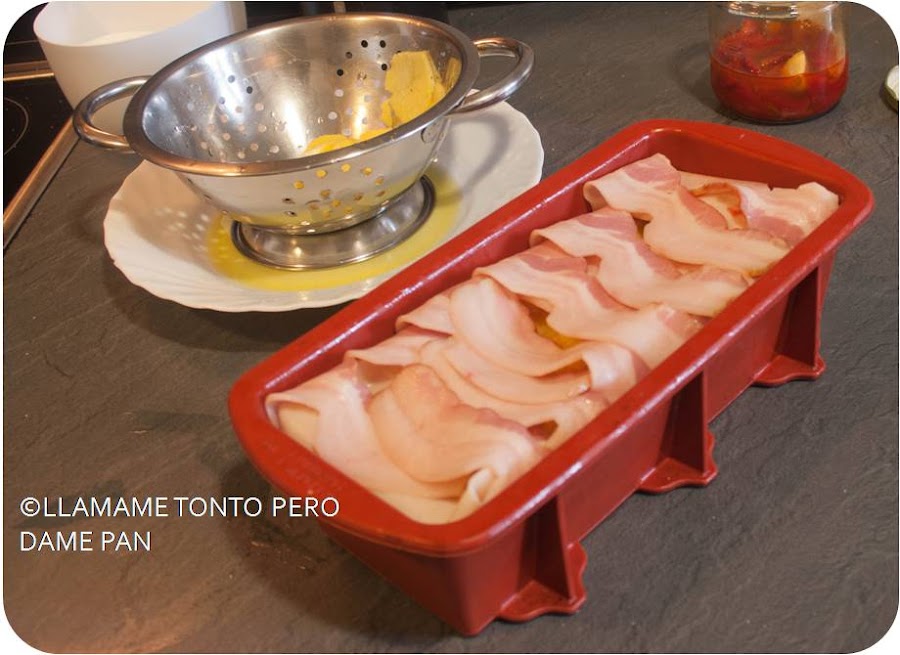 Colocamos las lonchas de bacon en un lateral; deben ir del centro del molde hacia el exterior, colgando parte de la loncha hacia fuera.