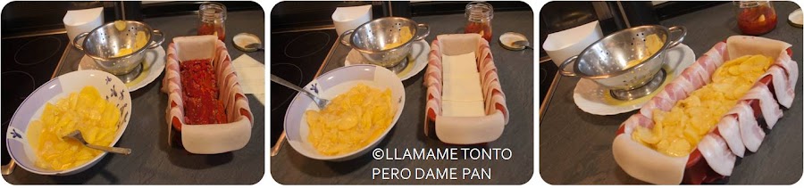 En los extremos pongo las lonchas de jamón o pavo. Podéis poner bacon, pero a mi me parece que queda demasiado pesado a la hora de comer el extremo.