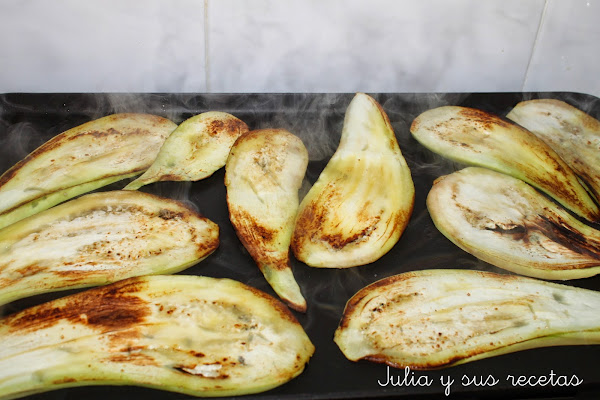 Pelamos las berenjenas y las cortamos en lonchas finas a lo largo. Las hacemos a la plancha.