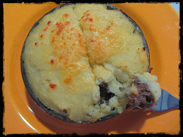 De hecho, esta receta, según tengo entendido, es de origen francés (se llama en Francia "Hachis Parmentier", pero nada que ver con los "cigarritos de la risa"), y surgió precisamente para "dar salida" a las sobras de estofados y guisos de carne. Así que podéis utilizar para prepararlo cualquier plato de carne que os haya sobrado: siempre queda rico. La cebolla rehogada le da un punto de jugosidad muy bueno.