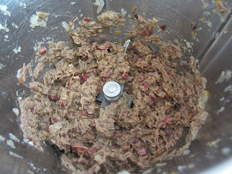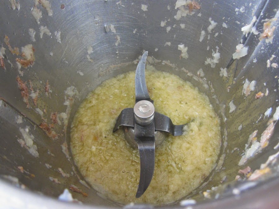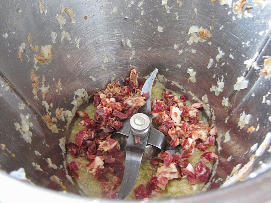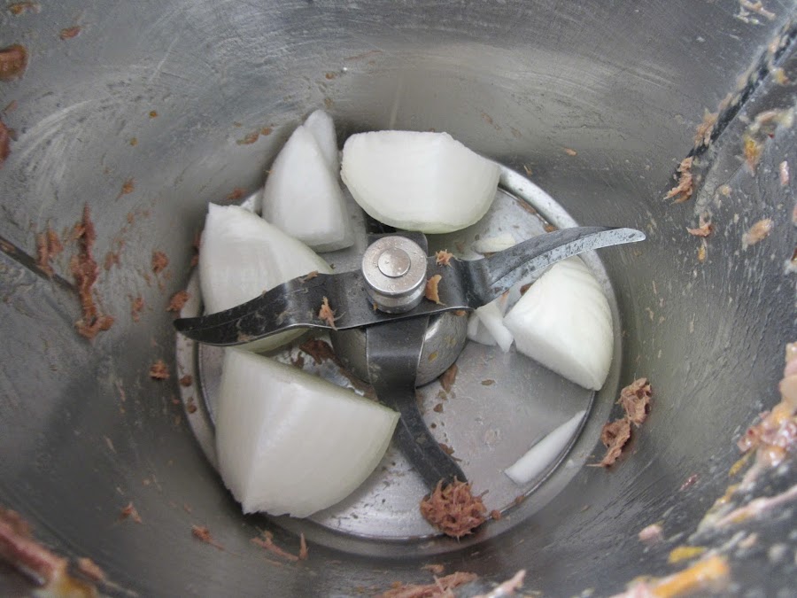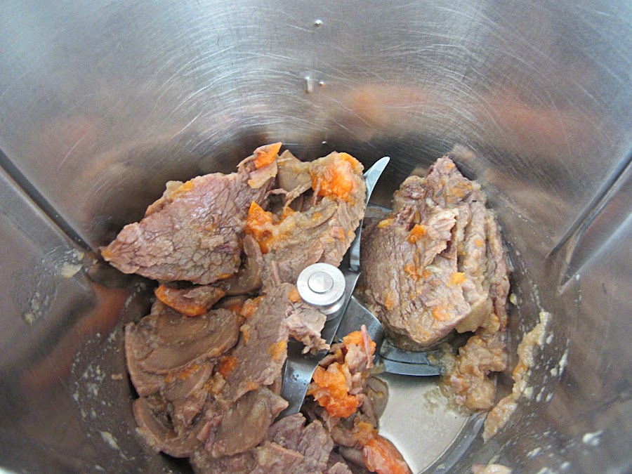 Picamos la carne en trocitos pequeños. En Thermomix, programamos 5 segundos a velocidad 5.