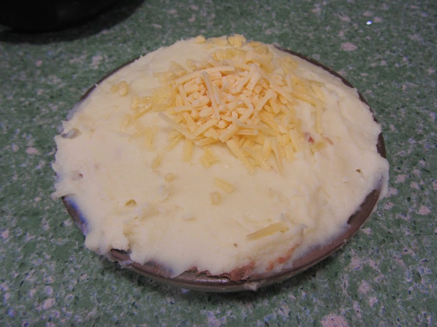Tapamos con otra capa de puré, igualamos la superficie, y cubrimos con queso rallado.