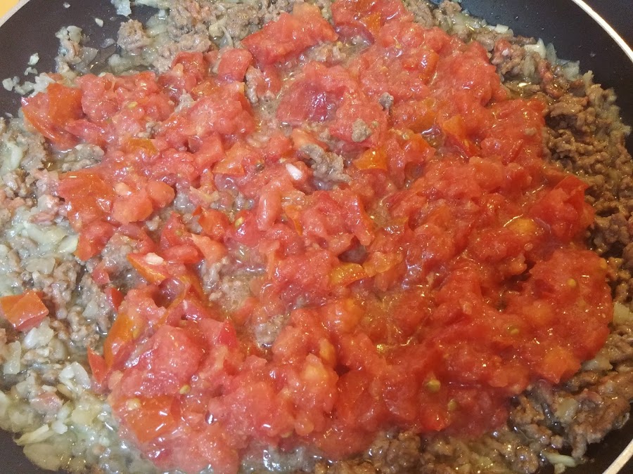 Incorporamos los tomates picaditos. Dejamos unos 10 minutos. Ponemos a precalentar el horno.