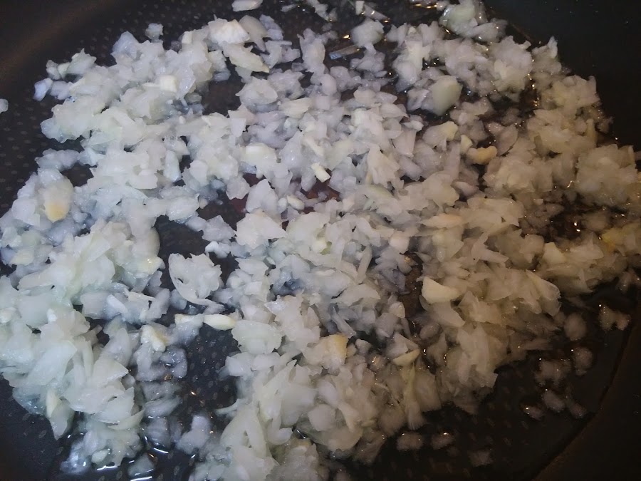 En una sartén amplia ponemos aceite y freímos la cebolla y el ajo muy picados. Dejaremos unos 7 u 8 minutos.