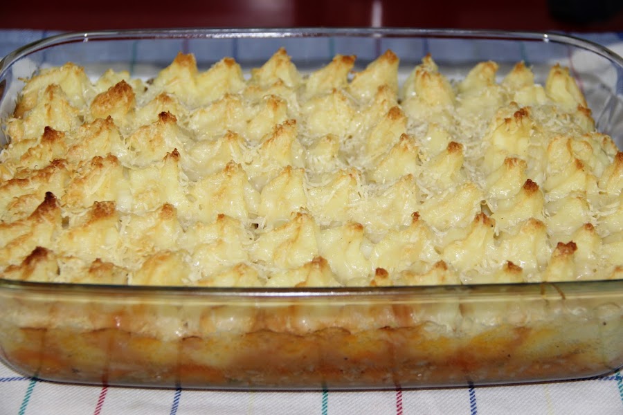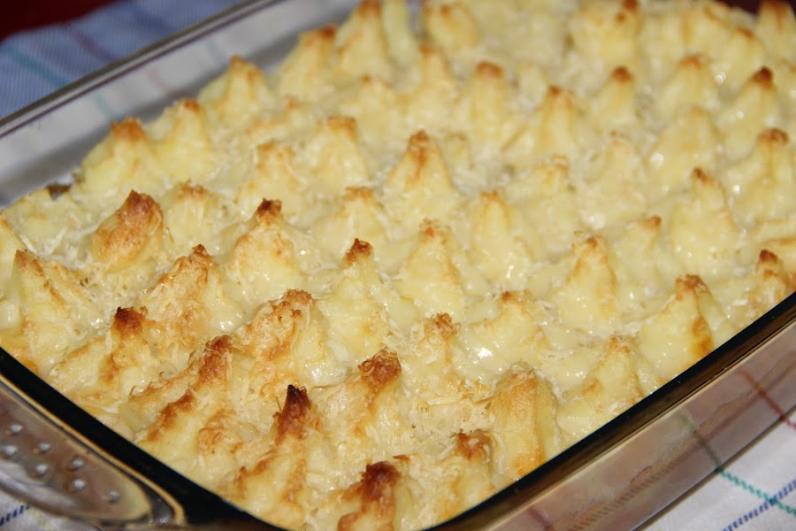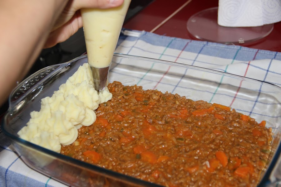 Con la ayuda de una manga vamos poniendo el puré de patatas enriquecido.